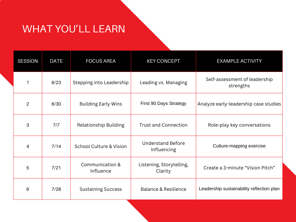 Each session builds on the last, guiding you step by step through the critical first stages of school leadership.