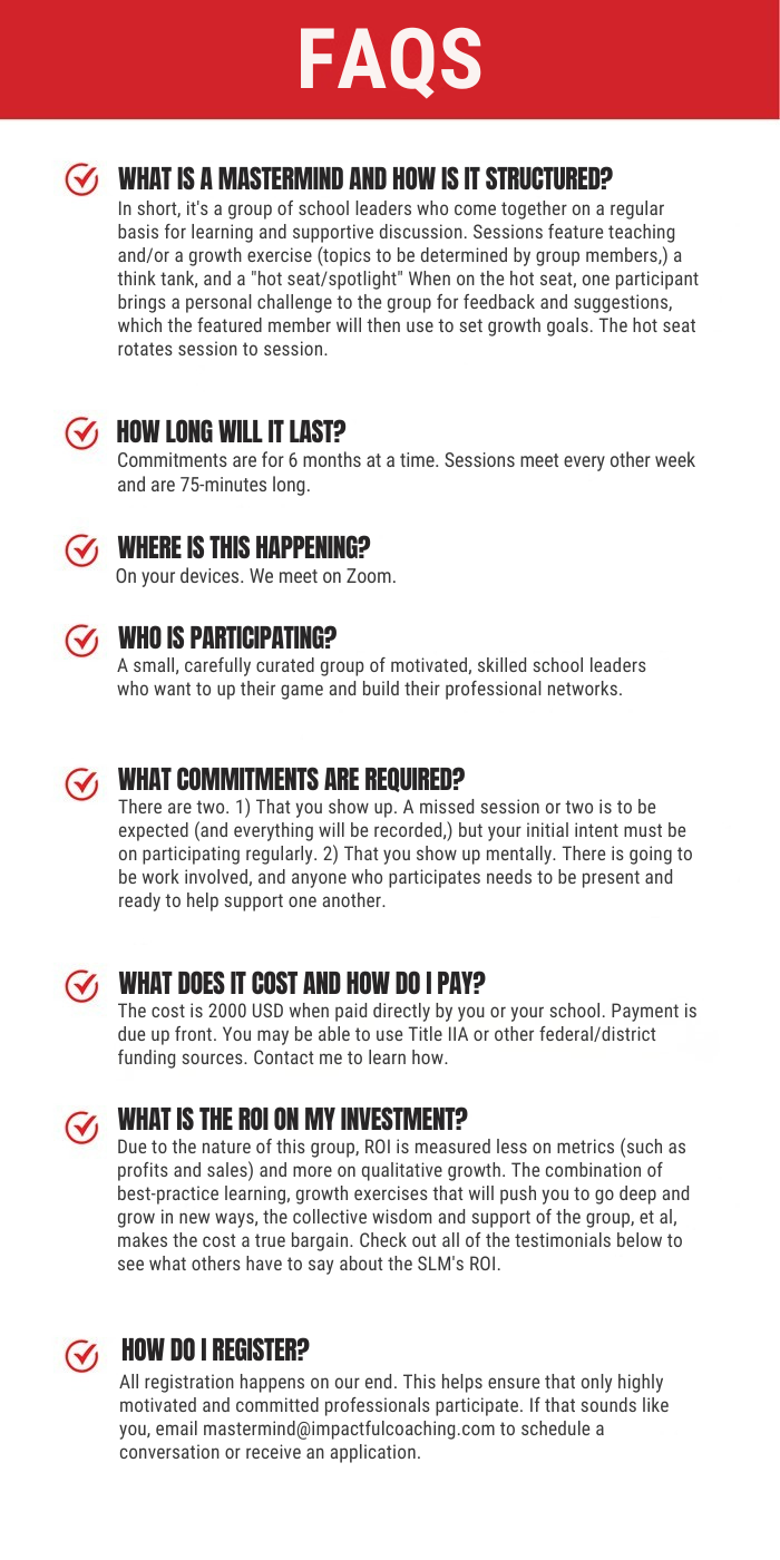 “The School Leadership Mastermind has given me a chance to step back, reflect on my journey as an administrator and collaborate with others in similar roles! It has allowed me to refocus my priorities and personal goals for myself in the field. We get so caught up in the day to day school interruptions that sometimes we lose sight of the bigger picture. SLM really helps you reset and refocus! ”